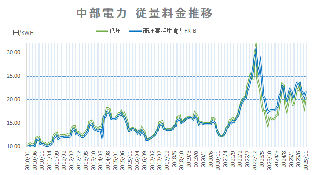 2025年10月度使用分(11月検針分)中部電力電力量料金推移