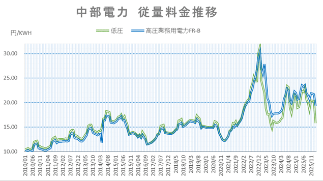 中部電力の電力量料金推移でも、同様の傾向が確認できます。