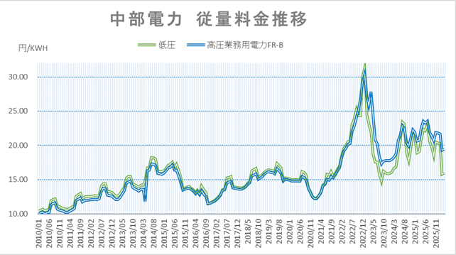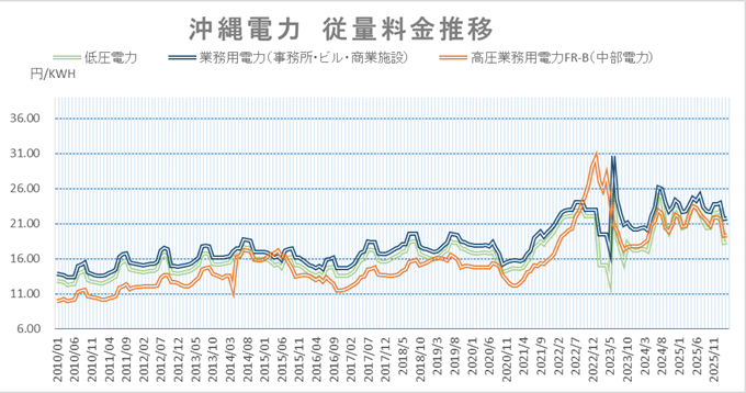 中部電力・沖縄電力の燃料費調整額等を反映した電力量料金推移を見ると、