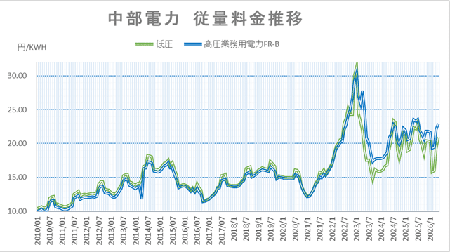中部電力エリアの推移を見ると、2023年のピーク時(30円超)に比べれば落ち着いているものの、今月は再び上昇に転じています。