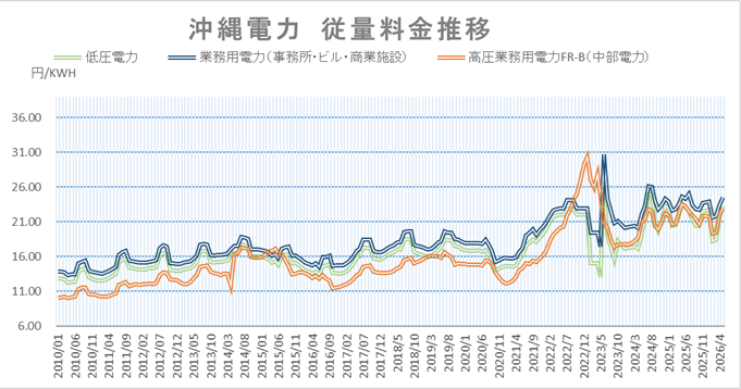 特に「業務用電力」は中部電力の高圧単価と比較しても 1.5円〜2円ほど高い水準 にあり、沖縄の事業所にとって電力コストの削減は最優先の経営課題と言えます。